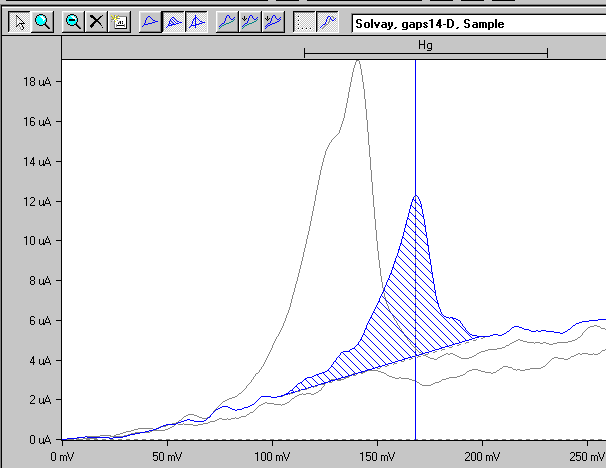 This trace shows a typical soil extract measurement with Hg peaks. The blue dashed curve represents the sample; the greyed curves represent the standard and the blank. The Hg concentration in the extract analysed was approximately 20µg/L.